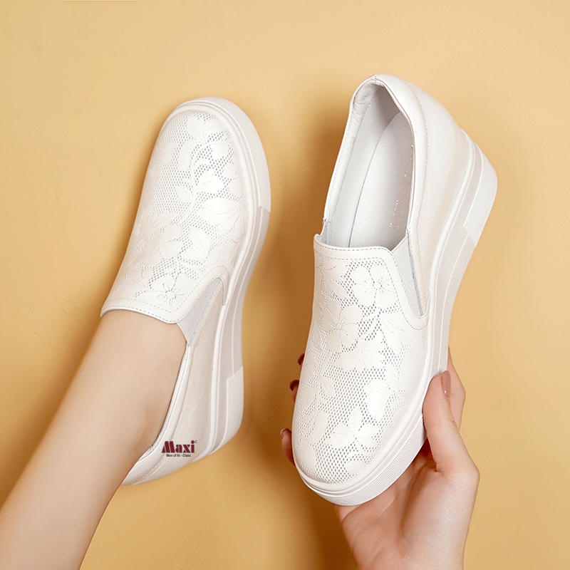 Giày nữ tăng chiều cao da thật màu trắng có hoa văn 6cm FS99